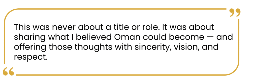 The book was not written for publication or recognition. It was a gift to the country —a reflection on how Oman could grow, evolve, and lead by remaining rooted in identity whilst embracing innovation.